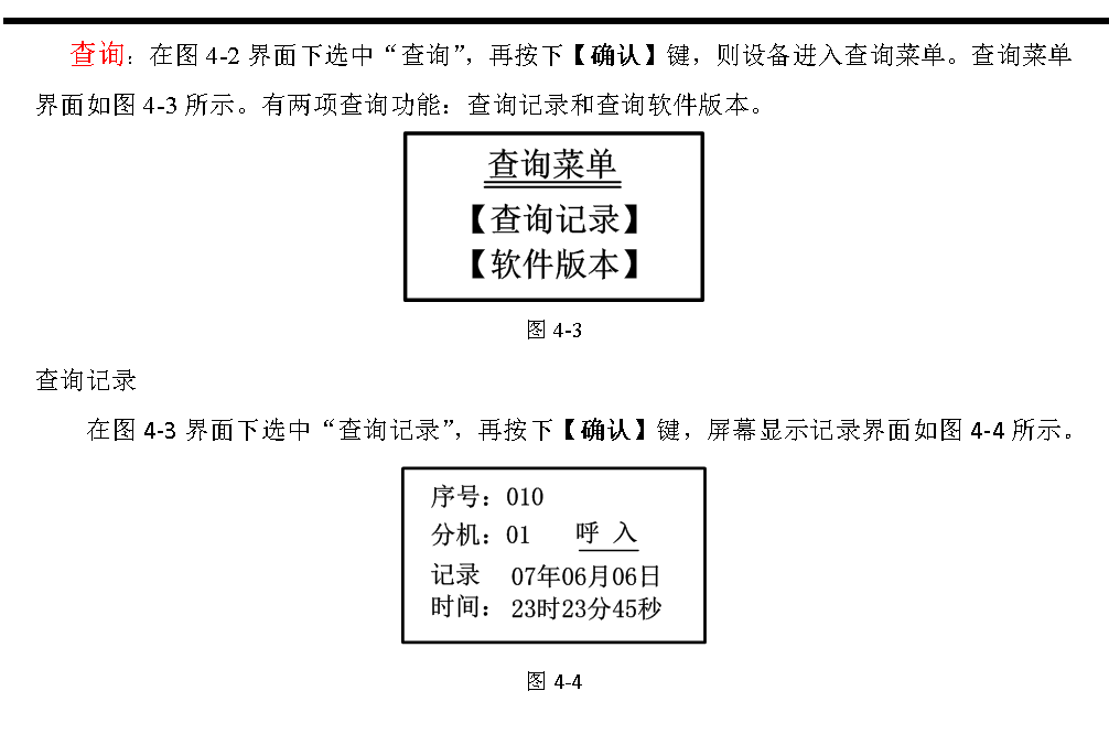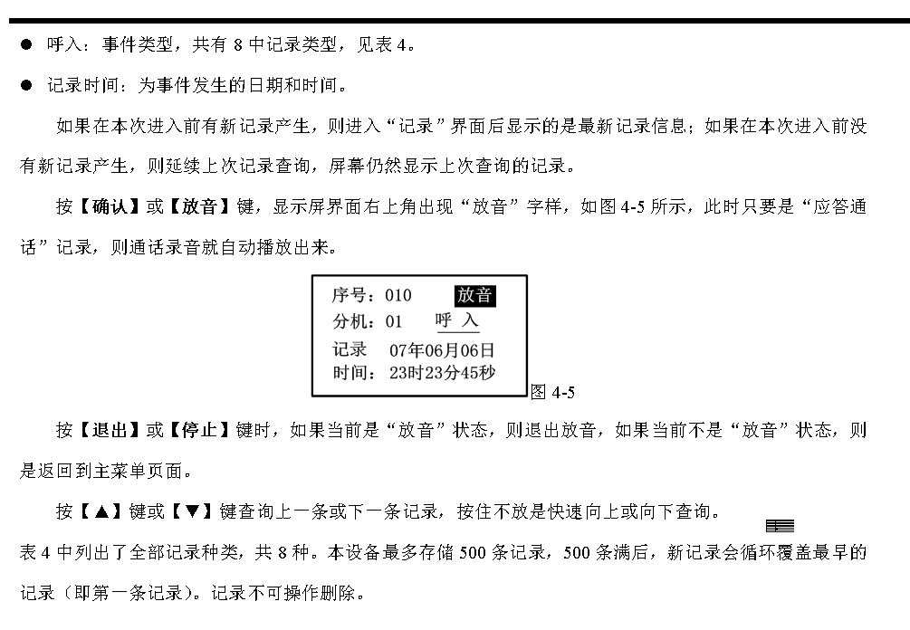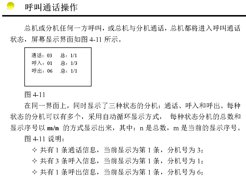 在圖3-16所示的呼叫通話顯示界面上,每種狀態(tài)的分機(jī)可能不止1個(gè),本設(shè)備采用自動(dòng)循環(huán)顯示方式,自動(dòng)循環(huán)顯示大約是每1.5秒顯示一個(gè)。在自動(dòng)循環(huán)顯示的同時(shí)也可手動(dòng)插入查詢循環(huán)顯示的分機(jī)號(hào)。按【▲】鍵或【▼】鍵分別是向前或向后逐個(gè)查詢,每按一下向前或向后顯示一個(gè),如果停止操作10秒鐘,那么又重新回到自動(dòng)循環(huán)顯示方式。