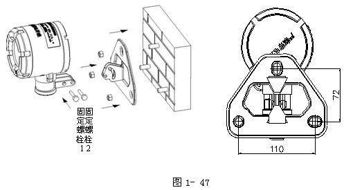 4、用M5的螺釘將探測器固定在調(diào)節(jié)架上,調(diào)節(jié)架可沿軸心轉(zhuǎn)動(dòng)60°調(diào)節(jié)架示意圖如圖1-50所示: