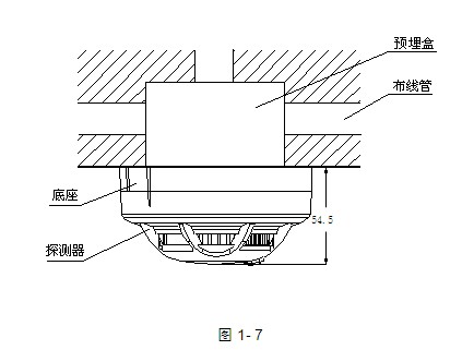 JTY-GM-GST9611海灣消防點型光電感煙火災(zāi)探測器安裝方式示意圖如圖1-7所示,接線盒可采用86H50型標(biāo)準(zhǔn)預(yù)埋盒。