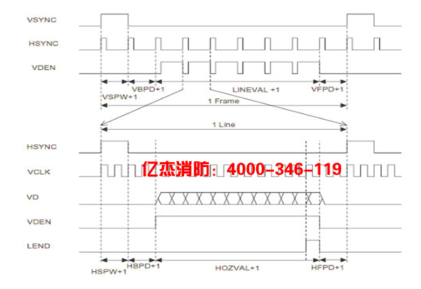 圖上是TFT屏的典型時序。其中VSYNC是幀同步信號,VSYNC每發(fā)出1個脈沖,都意味著新的1屏視頻資料開始發(fā)送。而HSYNC為行同步信號,每個HSYNC脈沖都表明新的1行視頻資料開始發(fā)送。而VDEN則用來標明視頻資料的有。